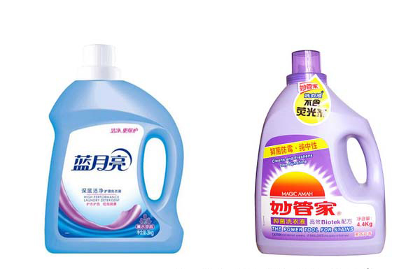 左邊的洗衣液瓶就是只貼單面的。右邊的那個(gè)洗衣液瓶要貼三張不干膠標(biāo)簽。雙側(cè)面要貼,而且還要在頸部部一張。這個(gè)有點(diǎn)難度,但是可以貼,用非標(biāo)準(zhǔn)機(jī)就可以加工了。