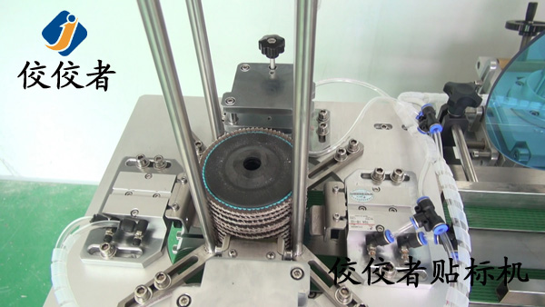 當(dāng)砂輪片被送到機(jī)器中間貼上標(biāo)簽時,貼標(biāo)還并未完全結(jié)束,砂輪片還要經(jīng)過下圖這個圓滾滾的柱體的適當(dāng)碾壓才算可以,這個圓柱體在其他全自動貼標(biāo)機(jī)上也有不同形式的出現(xiàn),只是其大小和樹立姿態(tài)不同,但都有個共同的目的,就是讓標(biāo)簽更緊實地貼在產(chǎn)品上,如下圖: