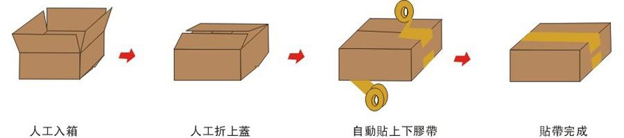 ◆ 本系列是以單機(jī)機(jī)型上下“一”字型貼膠帶,多規(guī)格化全自動(dòng)封箱包裝作業(yè)